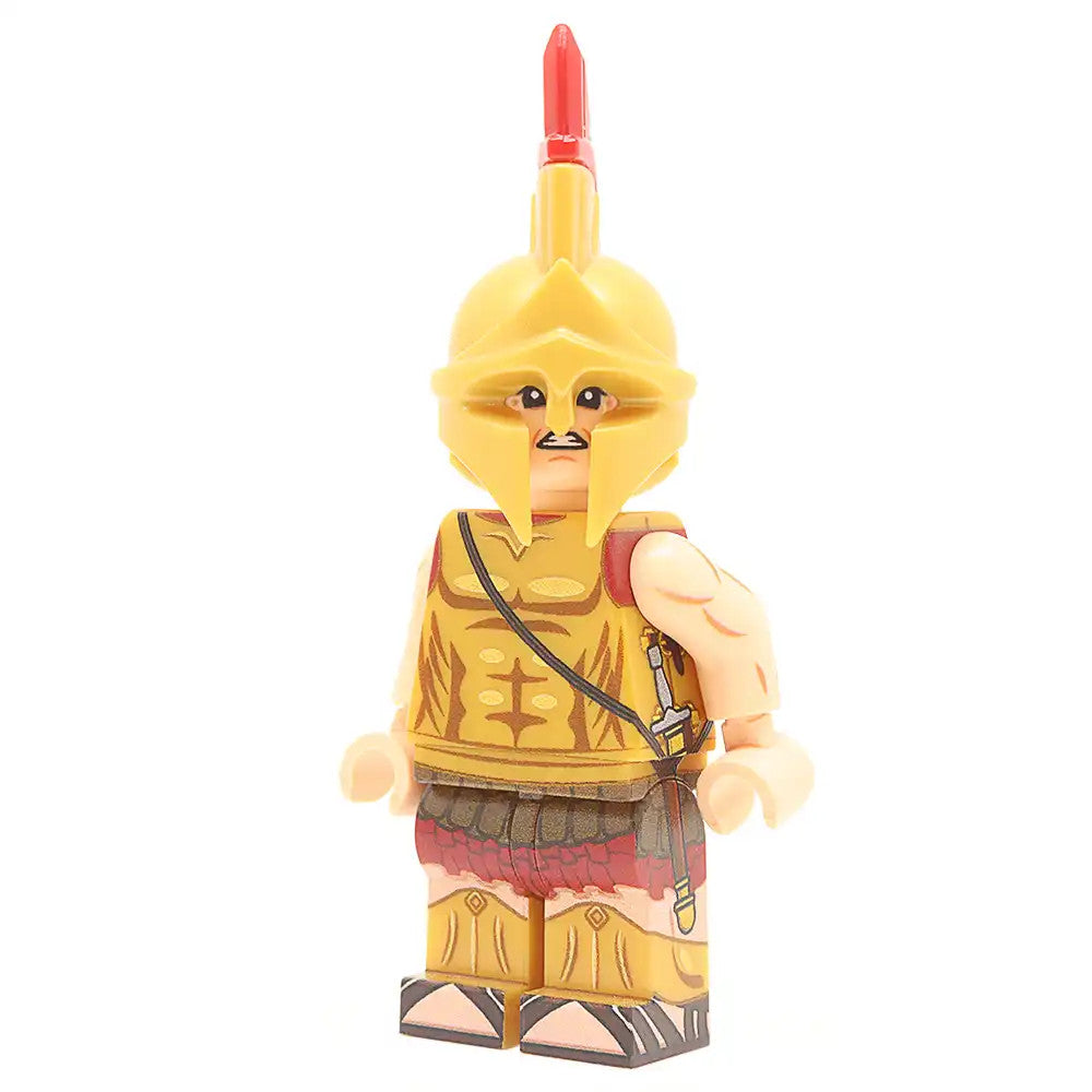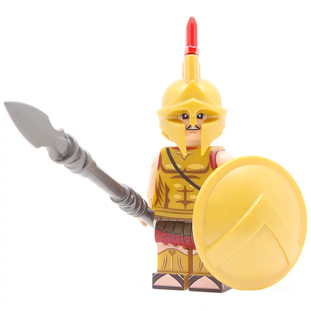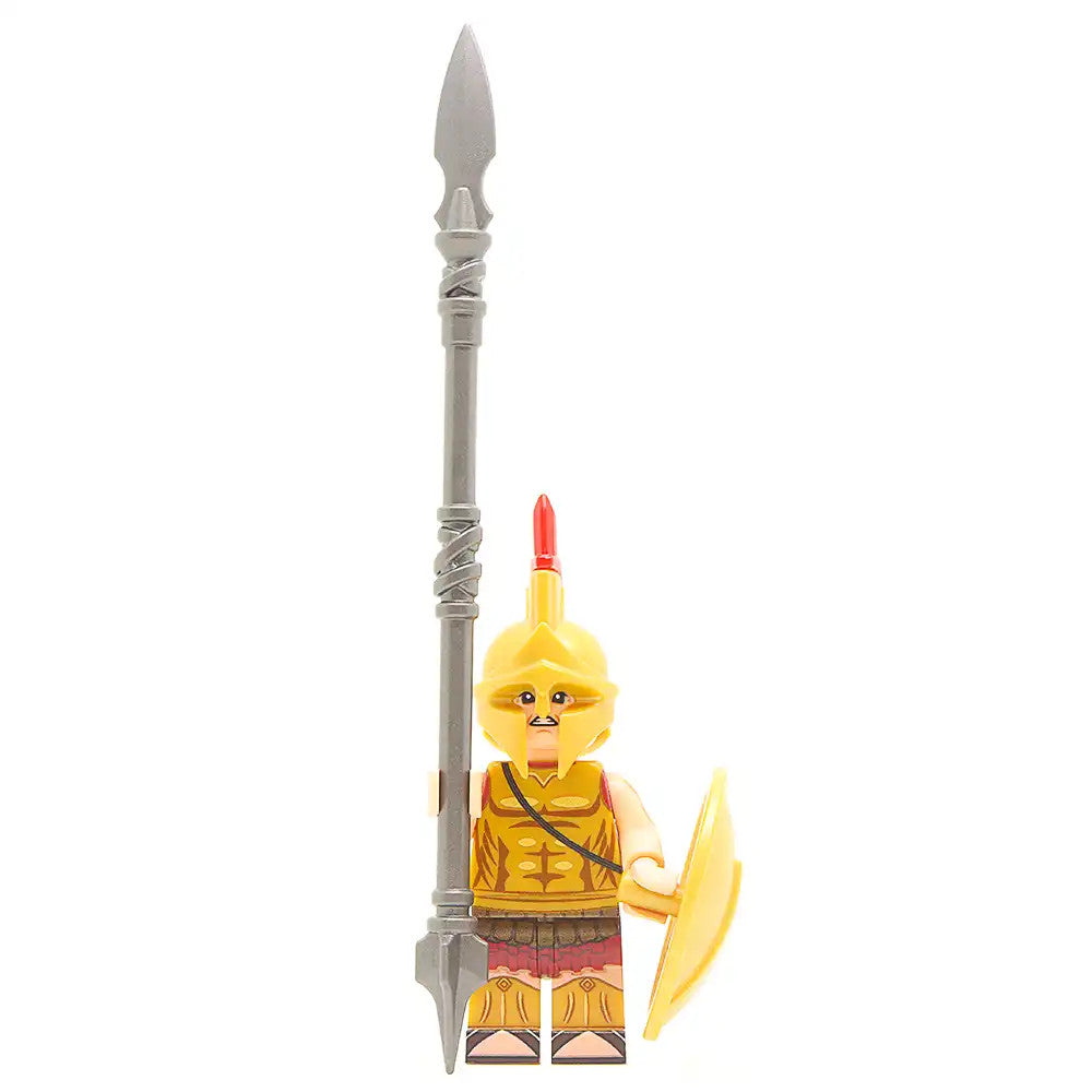 This Minifigure features a fully printed 360 torso and legs, along with a printed head. In addition it features a Brickwarriors Greek helmet with plume, Sarissa spear and shield.