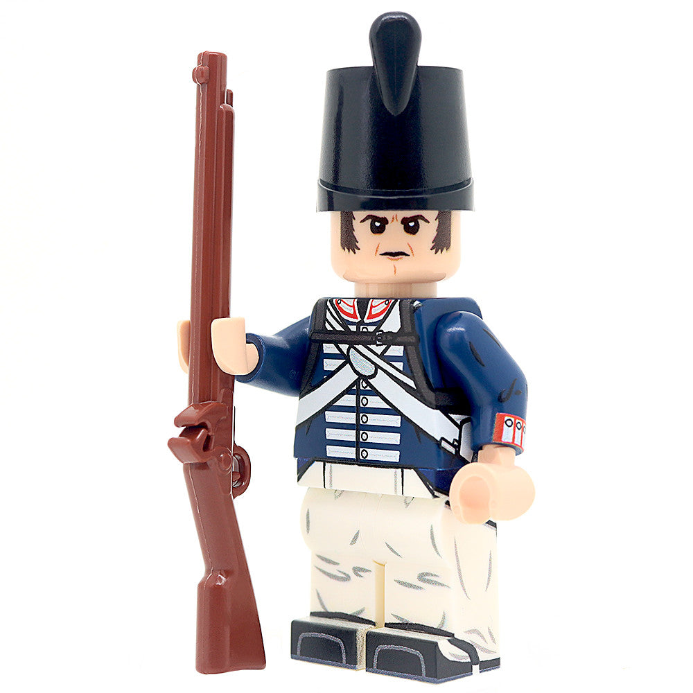 This Minifigure features a fully printed 360 torso, legs, along with a printed head. In addition it features a LEGO Shako Hat and BrickArms Flintlock Musket.