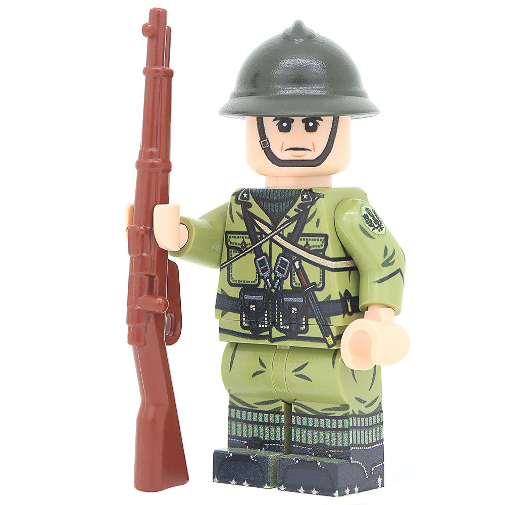 This Minifigure features a fully printed 360 torso and legs, along with a printed head. In addition, it features a BrickArms Adrian Helmet and BrickArms Carcano M38.