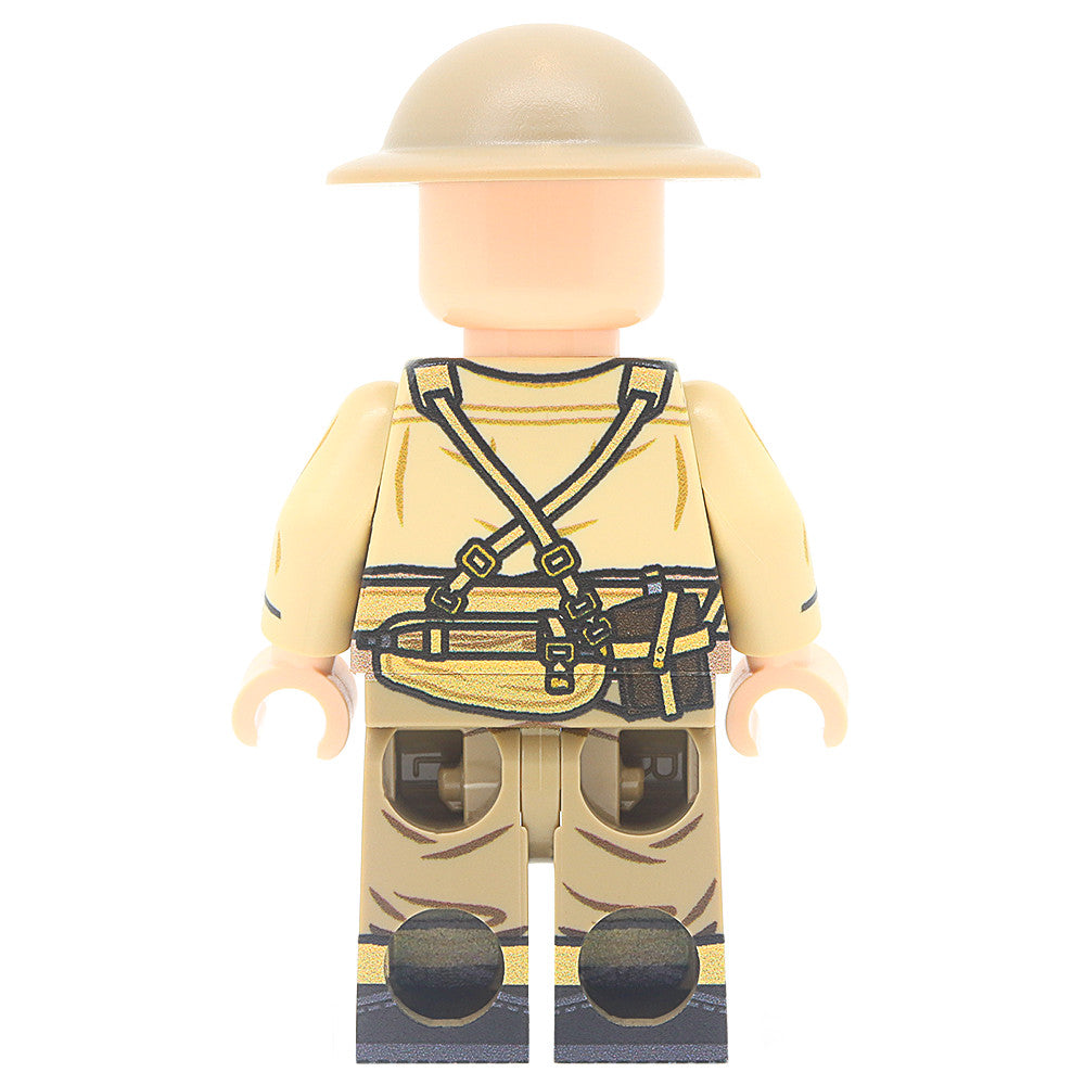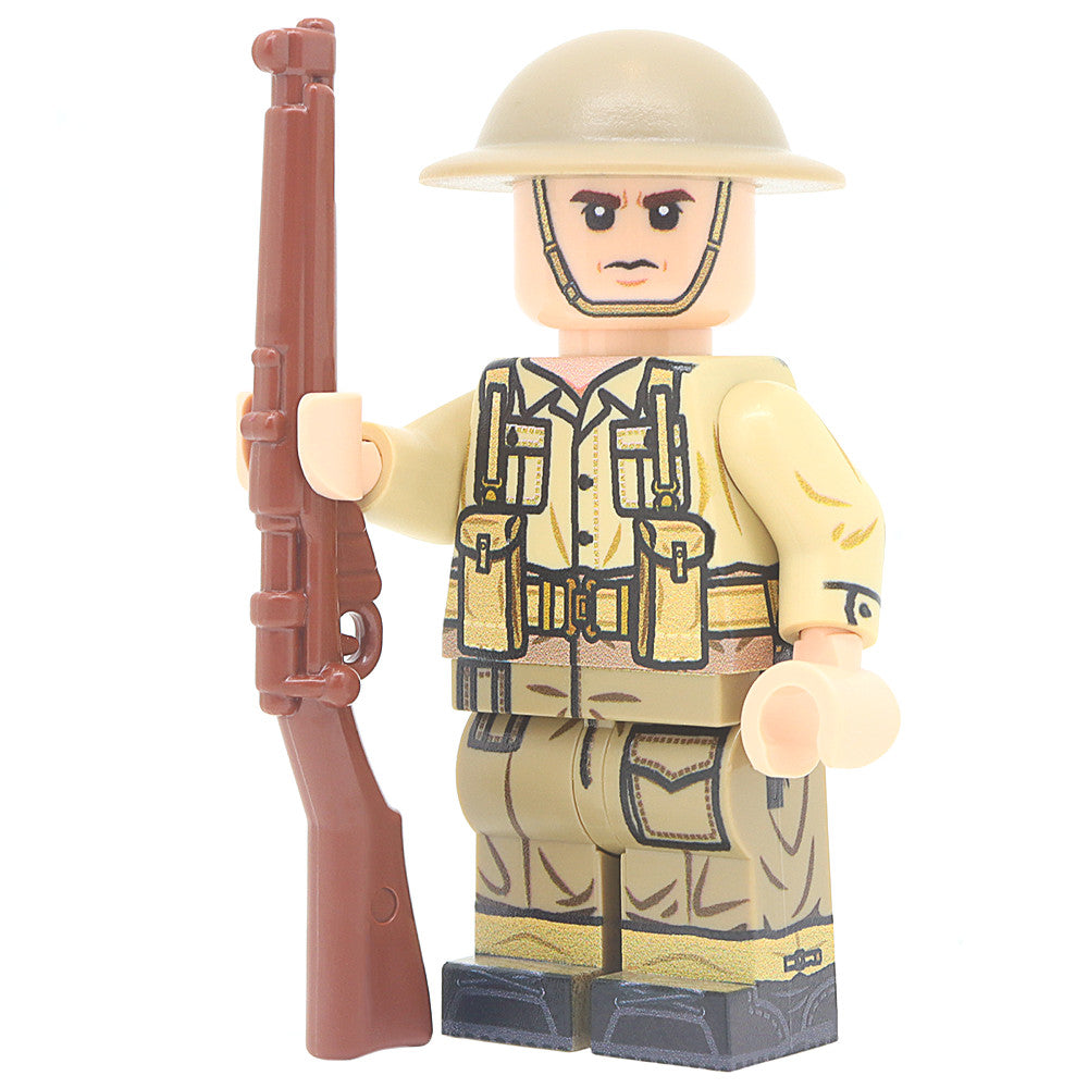 This Minifigure features a fully printed 360 torso, legs, along with a printed head. In addition it features a BrickArms Brodie Helmet and BrickArms SMLE Mk3 Rifle.