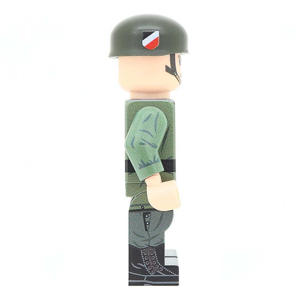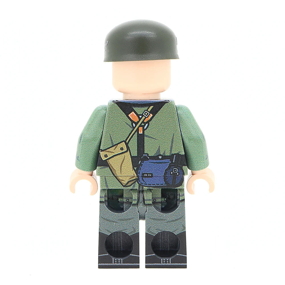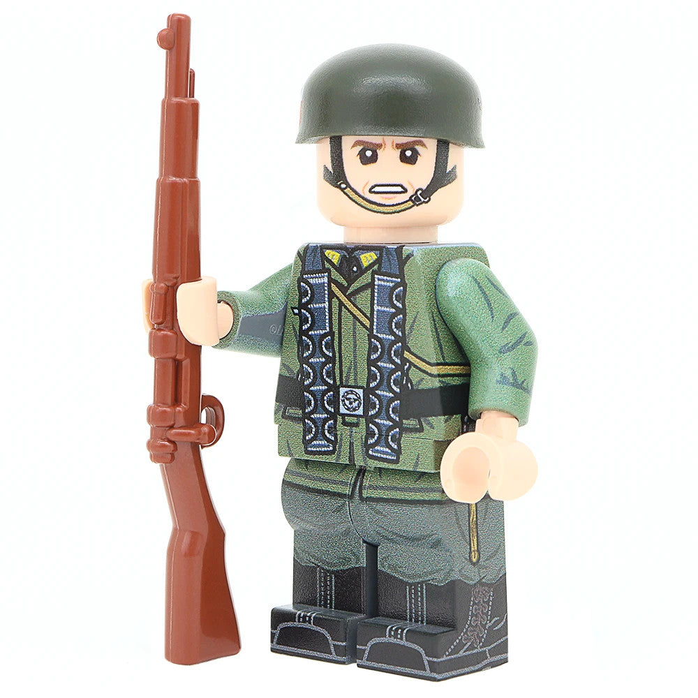 This Minifigure features a fully printed 360 torso, legs, along with a printed head. In addition it features a Custom Printed BrickArms Fallschirmhelm and BrickArms Kar98 Rifle.