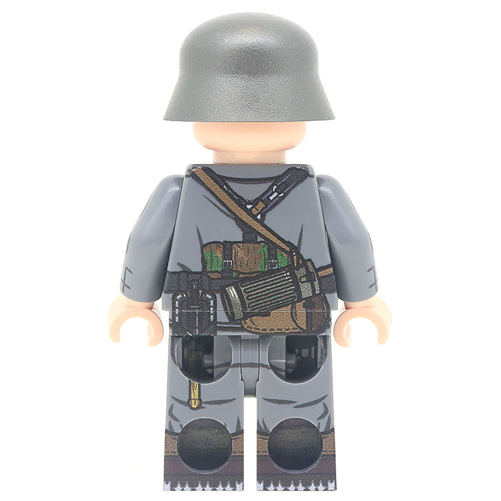 This Minifigure features a fully printed 360 torso, legs, along with a printed head. In addition it features a BrickArms Stahlhelm and BrickArms Kar98 Rifle.