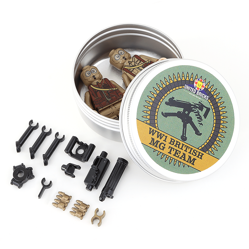 WW1 British Machine Gun Team minifigures in collectible tin - this is a United Bricks designed and printed figure set