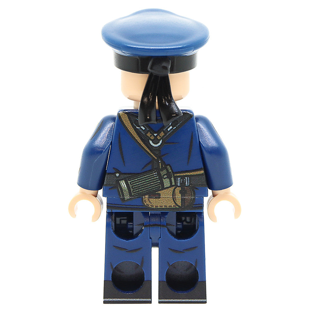 This Minifigure features a fully printed 360 torso, legs, along with a printed head. It comes with a custom made Sailor Cap and Brickarms KAR98k.